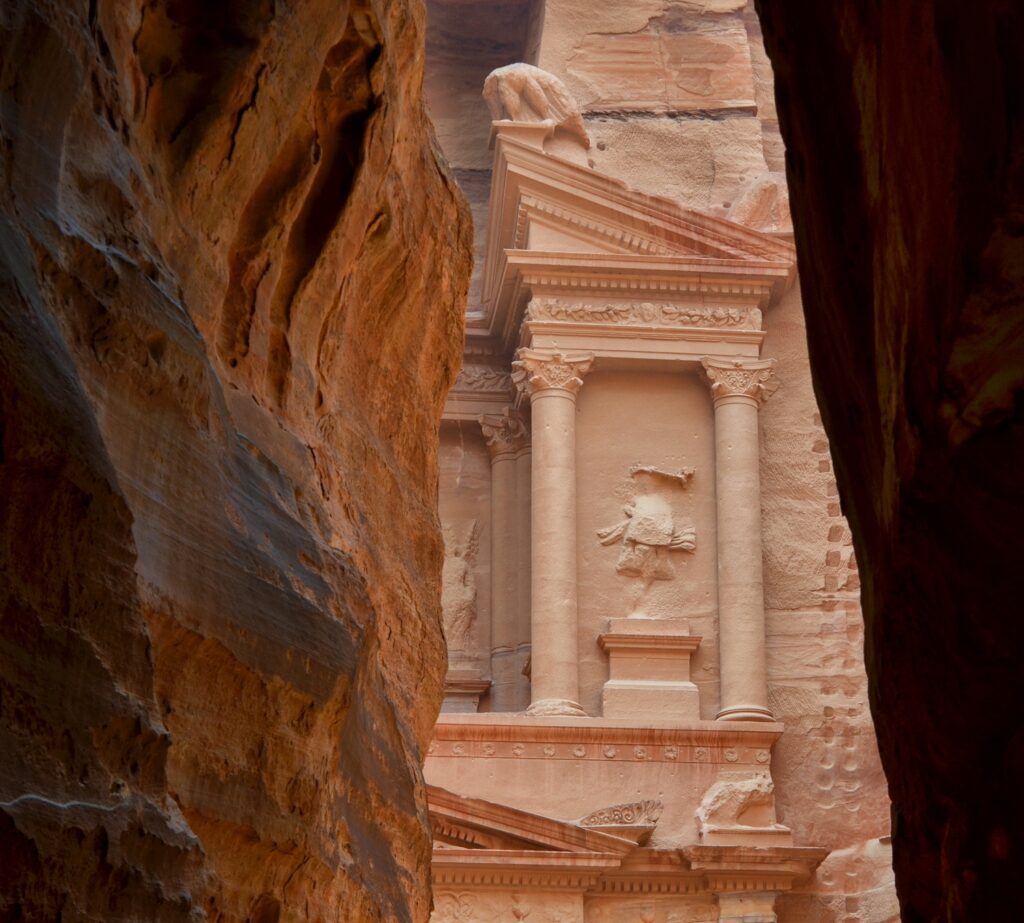 Ulazak u grad kroz kanjon Sik ima praktično, ali i psihološko značenje. Prolaz postepeno sužava pogled i utišava prostor, pre nego što se otvori ka centralnom delu grada. Riznica, najpoznatija građevina Petre, često se doživljava kao konačni cilj, ali ona je tek uvod. Iza nje se prostire kompleksan urbani prostor: ulice sa kolonadama, hramovi, grobnice različitih stilova, amfiteatar i sistemi za prikupljanje i distribuciju vode. Petra je primer grada koji nije nametnut pejzažu, već iz njega izvučen, prilagođen terenu i klimi.