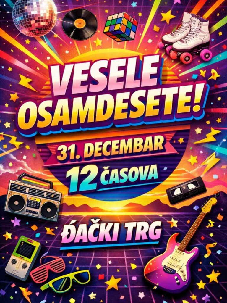 Centralni događaj proslave Nove godine održaće se 31. decembra na Đačkom trgu. Program počinje već u podne tradicionalnom dnevnom žurkom pod nazivom „Vesele 80-te“ u Galeriji Doma omladine.