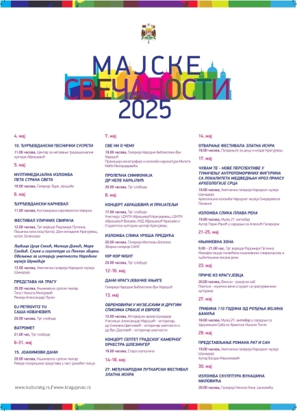 Đurđevdanskim pesničkim susretima sutra u Kragujevcu počinju Majske svečanosti, kojima će biti obeležen Dan grada, a trajaće tokom čitavog meseca kada nas na više lokacija očekuju brojni kulturni događaji, piše InfoKG.