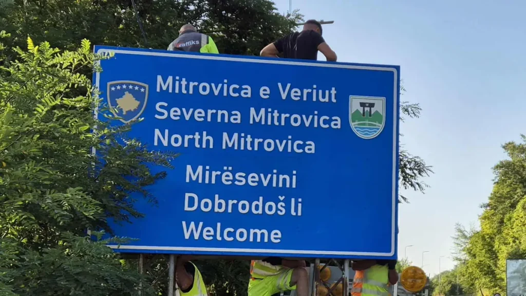 Ova tabla zamenjuje prethodnu, koja je uklonjena 10. aprila ove godine, a na kojoj su natpisi bili isključivo na ćirilici („Dobro došli u Kosovsku Mitrovicu“ i „Doviđenja“). Podsetimo, trećeg oktobra prošle godine sa iste lokacije uklonjene su stare ćirilične saobraćajne table za ulazak/izlazak iz opštine Zvečan i postavljene nove latinične, sa nazivom mesta prvo na albanskom, a potom i na srpskom latiničnim pismom.