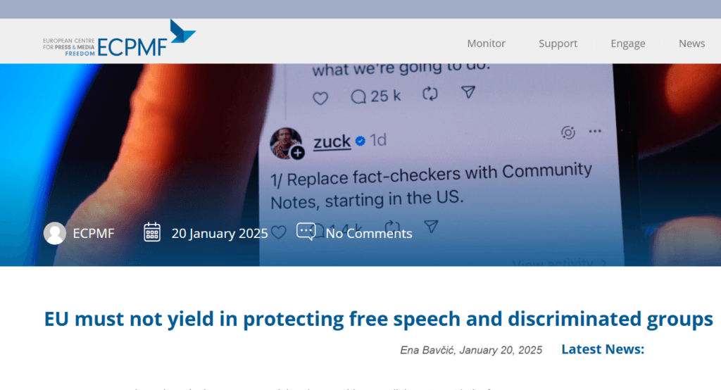 Konsultant za zastupanje EU u Evropskom centru za slobodu štampe i medija ( ECMPF ), Ena Bavčić, objavila je tekst koji ima za cilj da istakne ključne akcije koje se zahtevaju od Evropske komisije i lokalnih samouprava kako bi se suočile sa izazovima koje postavljaju medijski giganti i njihovi algoritmi. Mark Zakerberg iz Mete je 7. januara najavio prekid saradnje sa proverivačima činjenica u SAD i kritikovao regulatorne napore EU kao cenzuru. Ovaj potez izazvao je globalne reakcije. Meta, koja kontroliše platforme kao što su Facebook, Instagram i Vocap, igra značajnu ulogu u oblikovanju javnog mnjenja.