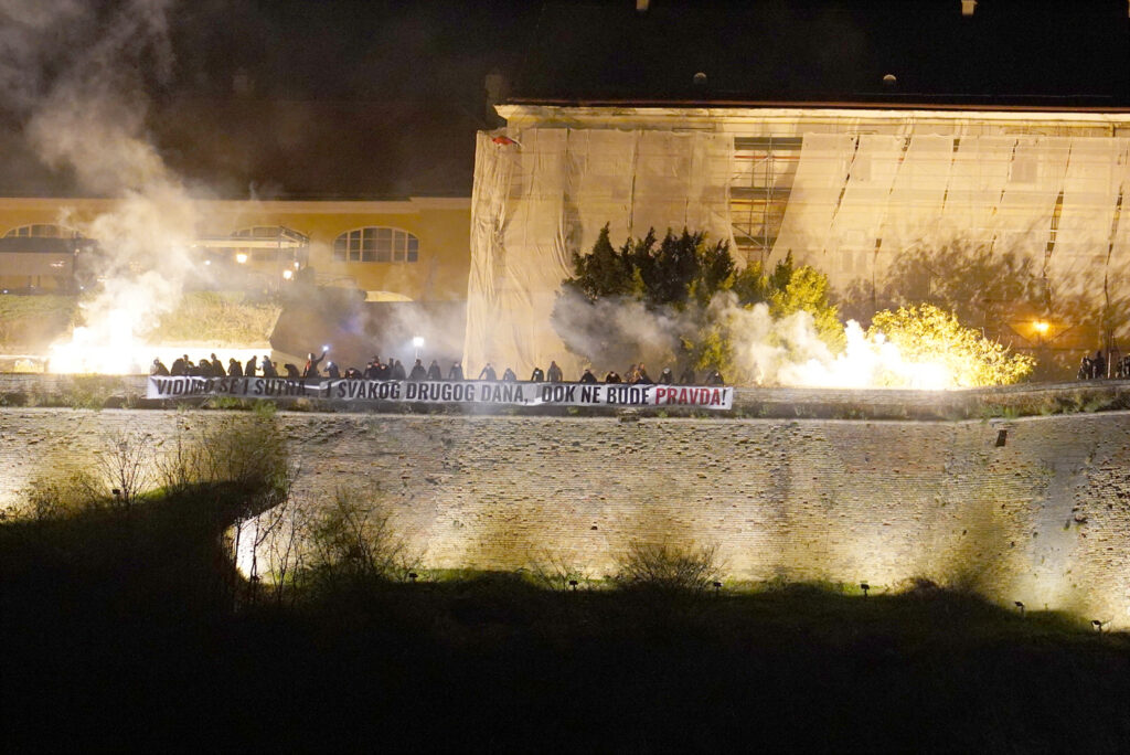 Tokom 16 minuta tišine, nakon puštanja lampiona, stidenti su sa Petrovaradinske tvrđave uz beli dim spustili transparent sa natpisom “Vidimo se sutra i svakog drugog dana, dok ne bude pravda”.