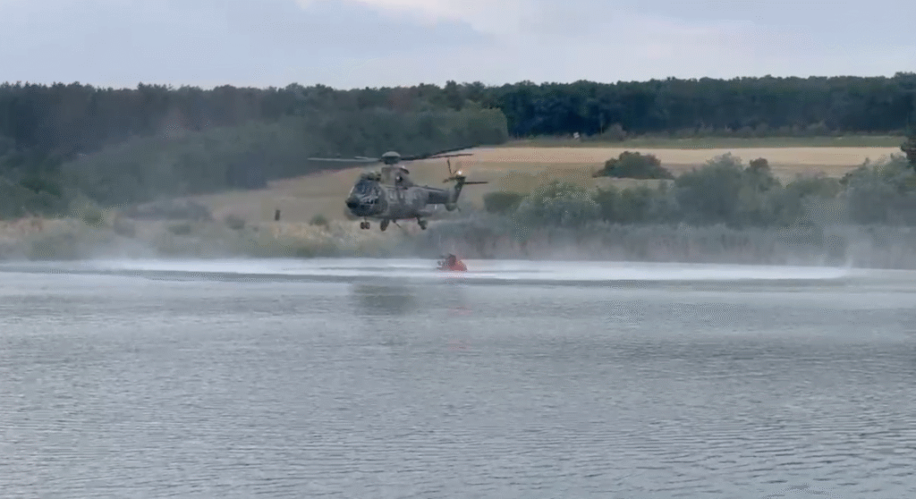 Helikopteri se aktivno spuštaju do Šumaričkog jezera kako bi zahvatili vodu potrebnu za gašenje požara. Video: SNM.rs (Serbian News Media)