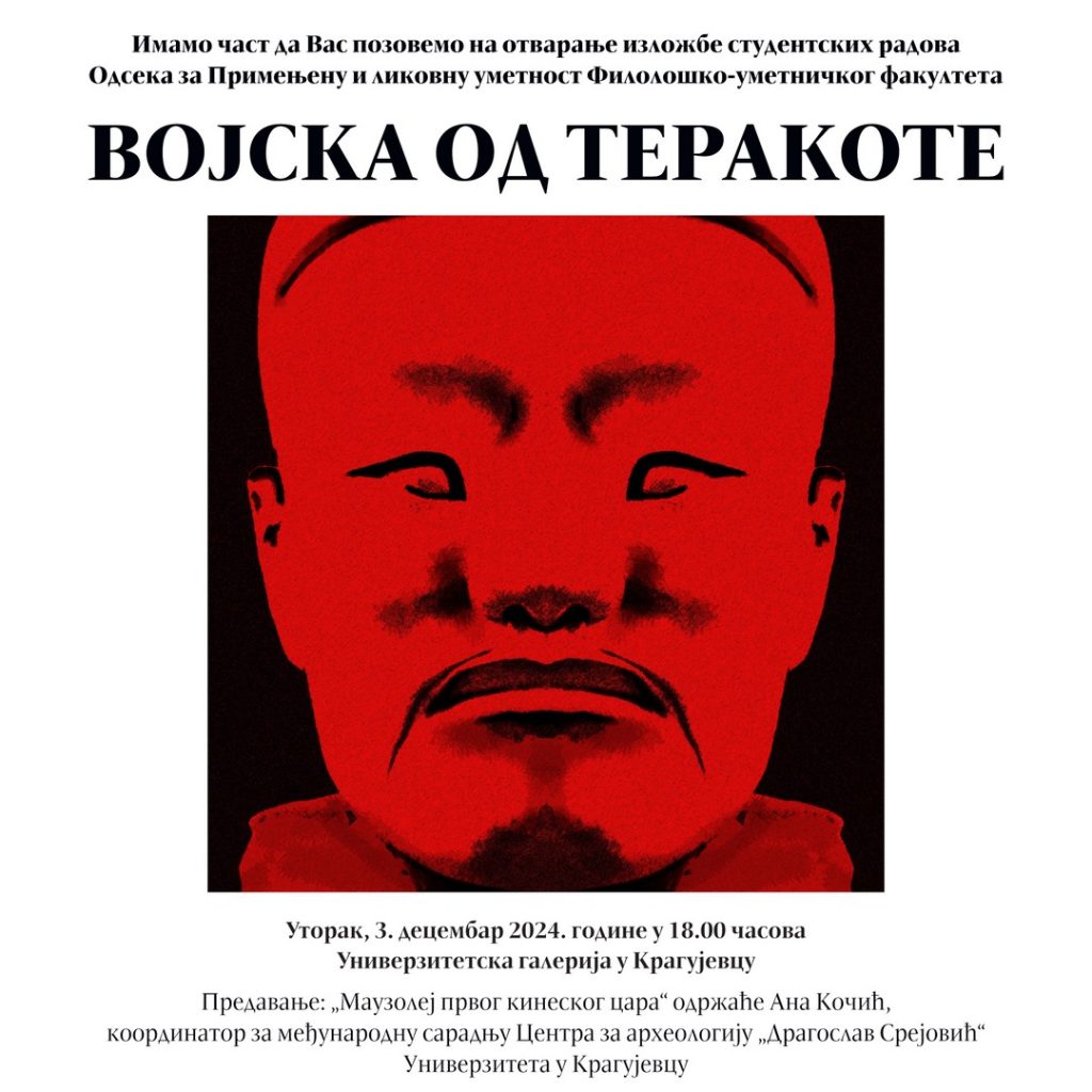 U Univerzitetskoj galeriji u Kragujevcu, u utorak, 3. decembra 2024. godine sa početkom u 18.00 časova, biće svečano otvorena izložba studentskih radova Odseka za Primenjenu i likovnu umetnost Filološko-umetničkog fakulteta, pod nazivom Vojska od terakote.