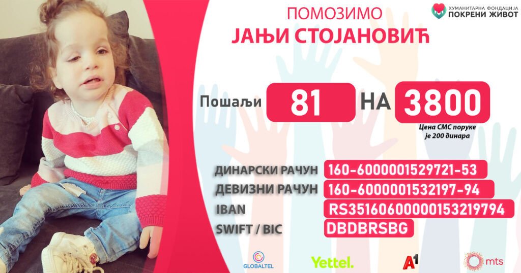 Janji je potrebno još 25 000€ kako bi otisla po drugu dozu leka, života važan. Nakon prve doze leka, Janja je postala mnogo bolje, ali da bi još bolja bila, mora primiti još jednu dozu.