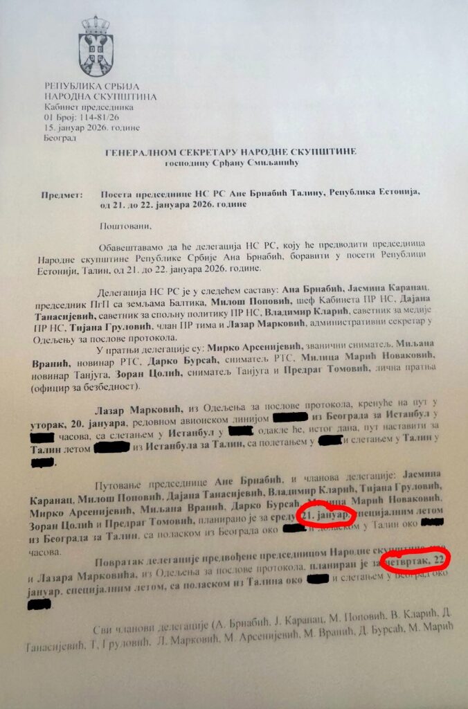Janjić: „Dokument potvrđuje da se Brnabić vraća iz Estonije dan pre sastanka sa delegacijom EP“