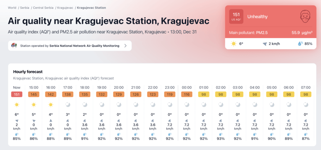 Prema „IQ Air“ informacijama, trenutno je u Kragujevcu veća zagađenost vazduha nego u Beogradu.