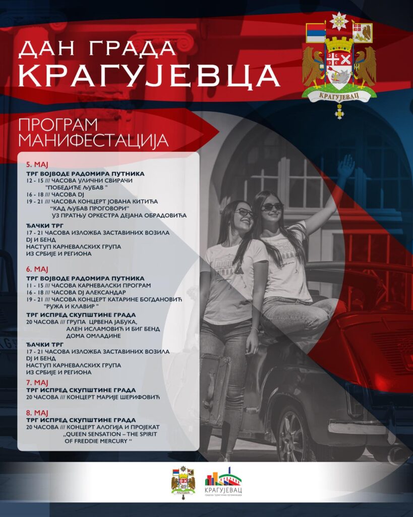 Kragujevac će Dan grada obeležavati od 5. do 8. maja, uz program na više lokacija u gradu. Najavljeni su koncerti, karnevali, izložbe i drugi sadržaji, a 6. maja biće održan i Dečji Đurđevdanski Karneval.