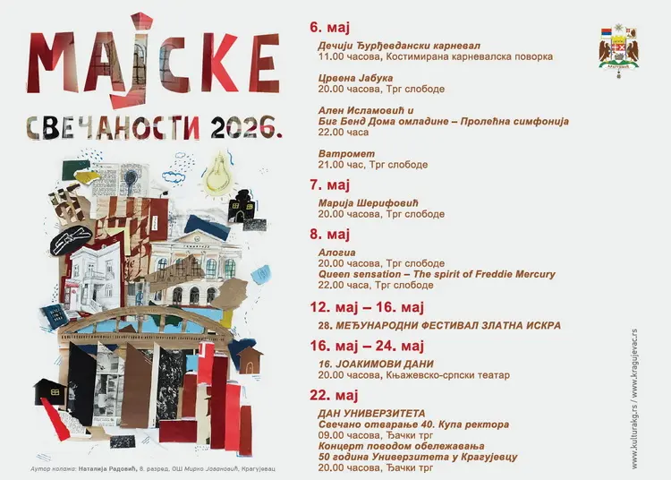 U Istorijskom arhivu Šumadije od 4. do 12. maja biće postavljena izložba „Znameniti Kragujevčani prestonog Kragujevca“. U okviru Majskih svečanosti održavaju se i dva pozorišna festivala. U Pozorištu za decu i mlade od 12. do 16. maja je Zlatna iskra, Međunarodni lutkarski festival, 28. po redu, a tradicionalni Jaoakimovi dani, posvećeni domaćem piscu, traju od 16. do 24. maja u Knjaževsko-srpskom teatru. Ana Petrović je pozvala sugrađane da prate program Majskih svečanosti, navodeći da je ova godina proglašena Godinom kulture. Sve najave i događaji biće dostupni na društvenim mrežama i sajtu www.kulturakg.rs. Univerzitet u Kragujevcu ove godine obeležava 50 godina postojanja i rada.