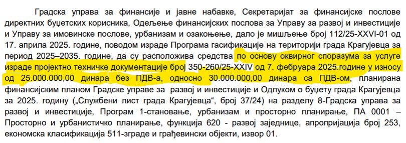 U delu donete Odluke koja se odnosi na finansiranje izrade Programa gasifikacije lepo piše da su po osnovu okvirnog sporazuma za usluge izrade projektno tehničke dokumentacije raspoloživa sredstva u iznosu 25.000.000,00 dinara bez PDV-a, odnosno 30.000.000,00 dinara sa PDV-om. 255 hiljada evra za 20 strana? Da vam prevedem 12.700 evra po strani.