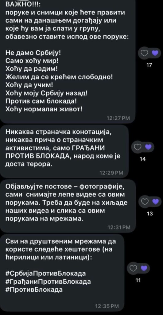 U objavljenim porukama detaljno se upućuje aktiviste kako da se ponašaju i šta da objavljuju na društvenim mrežama. Preporučeni su i haštagovi poput #SrbijaProtivBlokada i #GrađaniProtivBlokada.