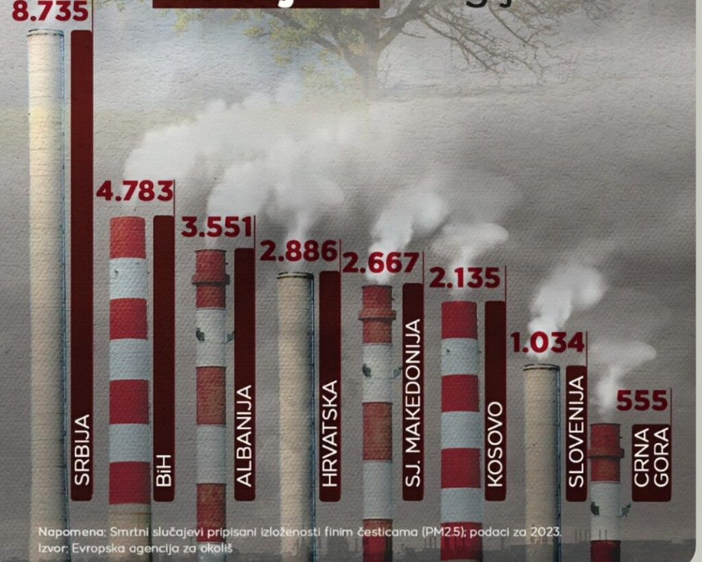 Takođe ističe da je u Srbiji tokom 2023. godine oko 11.000 smrtnih slučajeva bilo povezano sa zagađenim vazduhom u celini, dok je 8.735 posebno pripisano česticama PM2.5. Ove čestice su među najopasnijim zagađivačima, jer prodiru duboko u respiratorni sistem i krvotok.