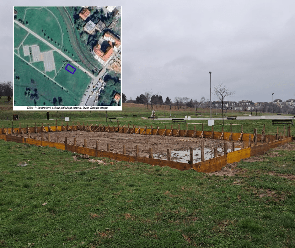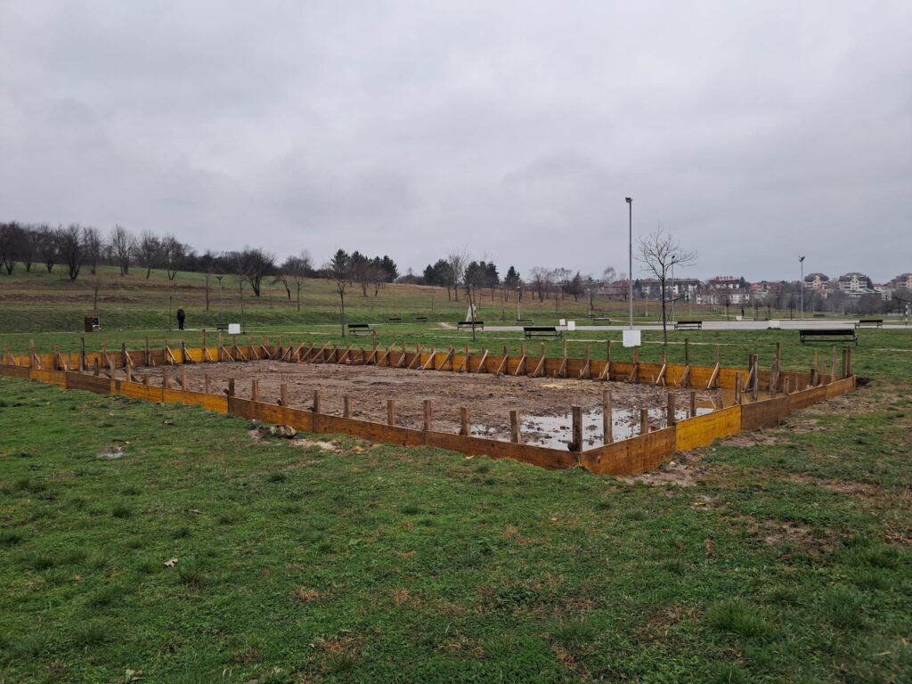 Na fotografijama i snimcima nastalim danas, 21. februara, na terenu je vidljivo da su pripremni radovi već u toku: formiran je pravougaoni gabarit, postavljena je drvena oplata duž celog oboda, oplata je učvršćena kosnicima i kolčevima, a površinski sloj trave i zemlje je uklonjen i teren poravnan. Unutar oplate nalazi se zemljana podloga sa tragovima raskvašenog materijala i lokvama, što ukazuje da je završena početna faza pripreme za naredne korake – tampon slojeve i izradu završne podloge.