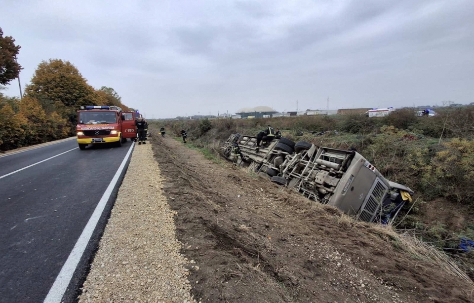 Autobus prevoznika „Sirmium bus“, koji je prevozio radnike firme „Heltcare“, iz za sada nepoznatih razloga sleteo je sa puta i prevnuo se na krov.