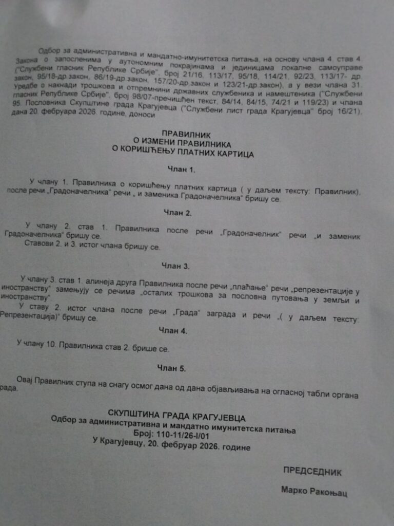 Gradski odbor stranke Srbija centar (SRCE) u Kragujevcu oštro je kritikovao nedavne izmene Pravilnika o korišćenju platnih kartica koje je usvojio Administrativni odbor grada, ocenjujući ih kao pokušaj legalizacije nenamenskog trošenja javnih sredstava. Saopštenje vam prenosimo u nastavku teksta.
