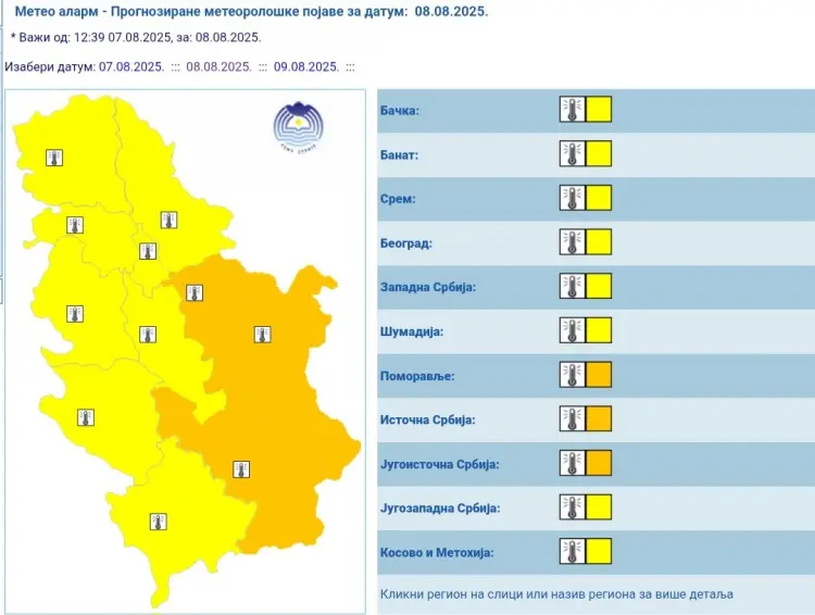 Republički hidrometeorološki zavod je izdao narandžasto upozorenje za petak, 8.8.2025. godine za područje Istočne Srbije, Jugoistočne Srbije i Pomoravlja (Borski, Zaječarski, Rasinski, Nišavski, Toplički, Pirotski, Jablanički, Pčinjski, Pomoravski, Podunavski i Braničevski upravni okrug) i za subotu 9.8.2025. godine za područje cele Republike Srbije, na ekstremno visoke temperature kada se očekuje veoma toplo vreme sa maksimalnom temperaturom ≥ 35°C.