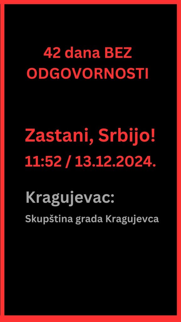 Kragujevčani se sutra okupljaju ispred Skupštine grada u 11:52. Ovom akcijom se pridružuju akciji koja će sutra biti održana u celoj Srbiji.