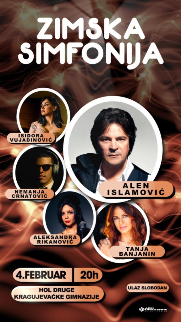 Dom omladine Kragujevac najavio je održavanje muzičkog programa pod nazivom „Zimska simfonija“, koji će se održati u sredu, 4. februara. Koncert je zakazan za 20 časova, a domaćin događaja biće Druga kragujevačka gimnazija.